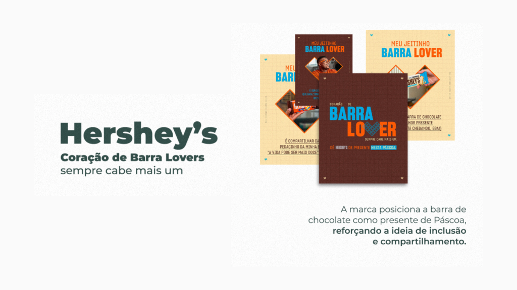 Com a assinatura “sempre cabe mais um”, a Hershey’s reposiciona sua clássica barra de chocolate como um presente afetivo e acessível para a Páscoa. O coração simbólico formado pelas barras remete à ideia de inclusão, carinho e partilha — valores que ressoam fortemente nesse período do ano.