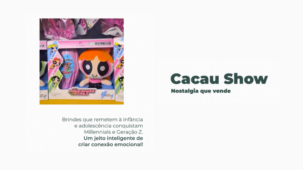 Uma das estratégias mais comentadas da Páscoa foi a aposta da Cacau Show em brindes colecionáveis que remetem à infância e adolescência. De brinquedos retrô a personagens icônicos dos anos 90 e 2000, a marca mira diretamente no coração dos Millennials e da Geração Z, despertando memórias afetivas que influenciam o comportamento de compra.